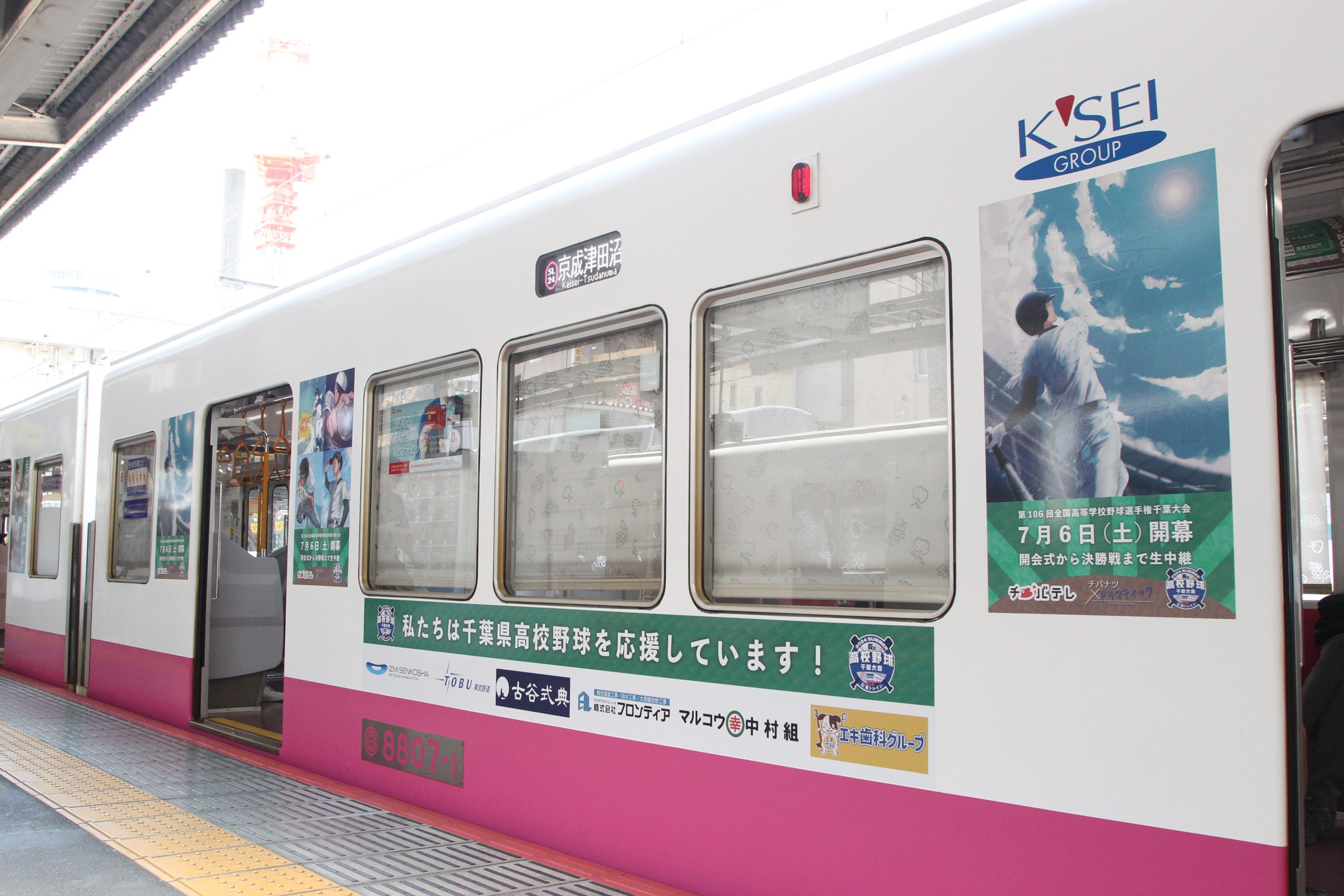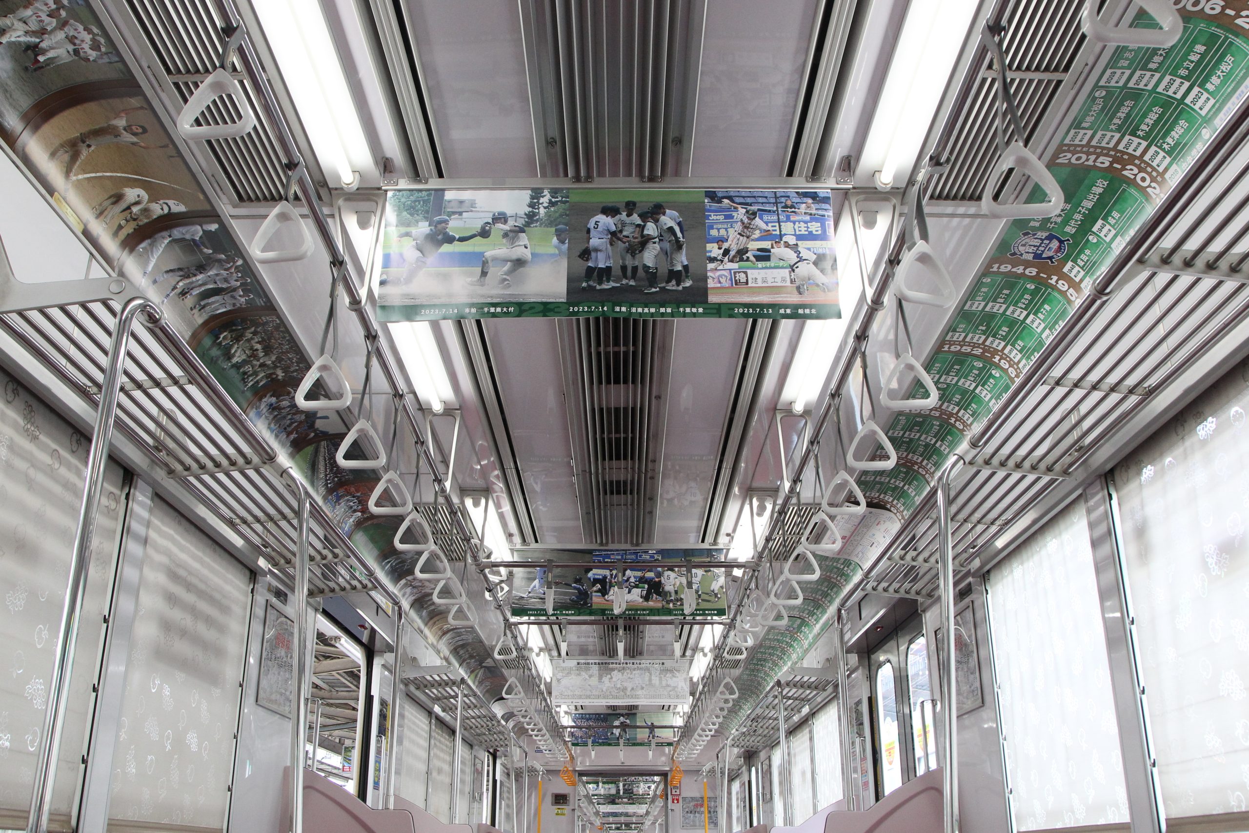 千葉テレビ放送「高校野球ダイジェスト」とのコラボレーション企画で、車内には千葉大会歴代優勝校を紹介したポスターに加え、千葉大会名場面の写真も掲出。車体には、学校法人花沢学園専門学校千葉デザイナー学院の学生が夏の高校野球千葉大会のためにデザインしたイラスト全11種類を掲出しました。
